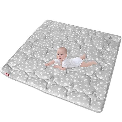 The Foldable and Reversible Baby Play Mat is designed to provide a safe and comfortable play area for your little one. Unlike other mats that are made up of multiple puzzle pieces, this play mat is a single durable piece that can be easily folded and packed away. It saves space and eliminates the hassle of assembling and disassembling puzzle pieces. The mat is 59x59 inches in size, offering plenty of room for your baby to crawl around or for you to join in the play. The cushioned and soft padding ensures a comfortable surface for your baby to explore and play on. The cute grey pattern and ultra-soft fabric make it visually appealing, and the non-slip backside provides sure footing and a safe place for your child to play. This play mat is also versatile and can be used as an area rug, tent mat, or playhouse mat. It is tested for harmful substances by GLOBAL OEKO-TEX, ensuring the safety and quality of the product. The Moonsea Guarantee offers peace of mind, as the mat can be washed or gently patted placed for a few days to return to its original state. If you encounter any problems, the company provides replacements or refunds without excuses. Description by ChatGPT.