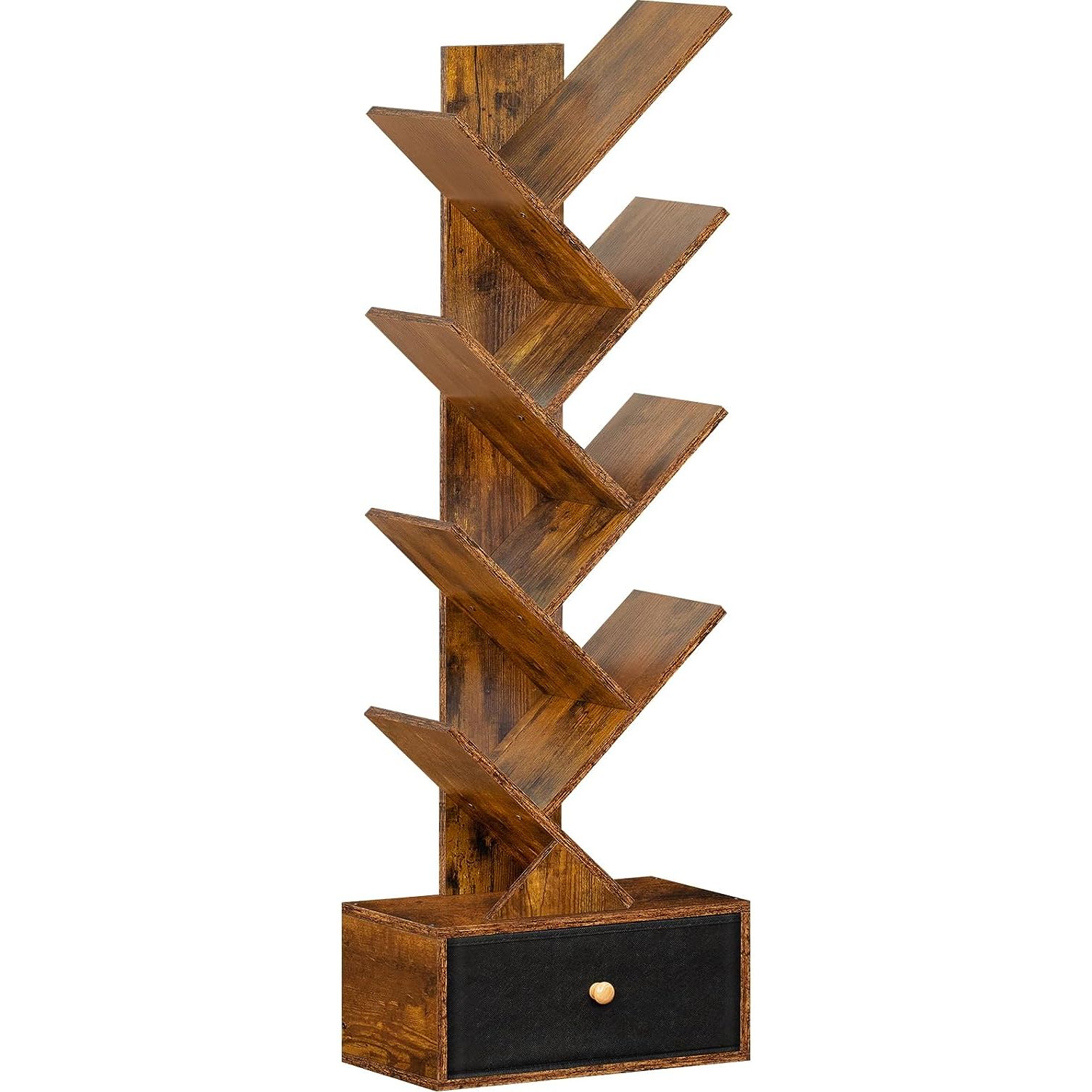 SHEEPAM 8 Tier Tree Bookshelf with Drawer, Free Standing Wood Bookcase for Narrow Space, Storage Organizer Bookshelves for Books, Book Case for Home Office, Living Room, Bedroom, Rustic Brown