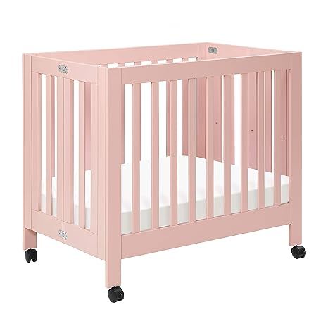 Babyletto Origami Mini Portable Folding Crib with Wheels in Petal Pink, 2 Adjustable Mattress Positions, Greenguard Gold Certified