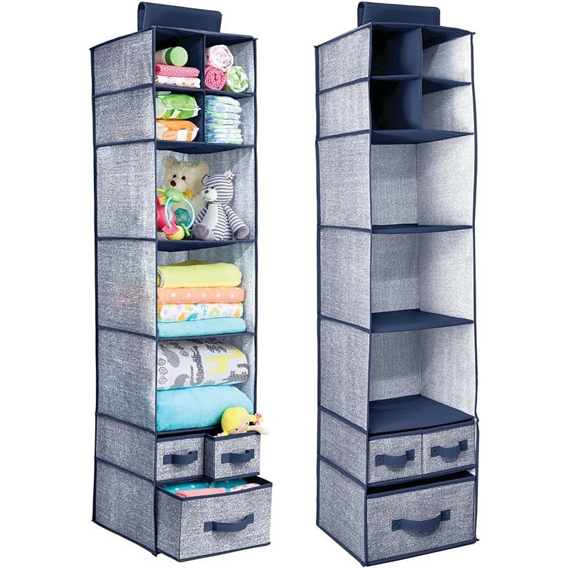 mDesign Soft Fabric Over Closet Rod Hanging Storage Organizer with 7 Shelves and 3 Removable Drawers for Child/Kids Room or Nursery - Textured Print - 2 Pack - Navy Blue