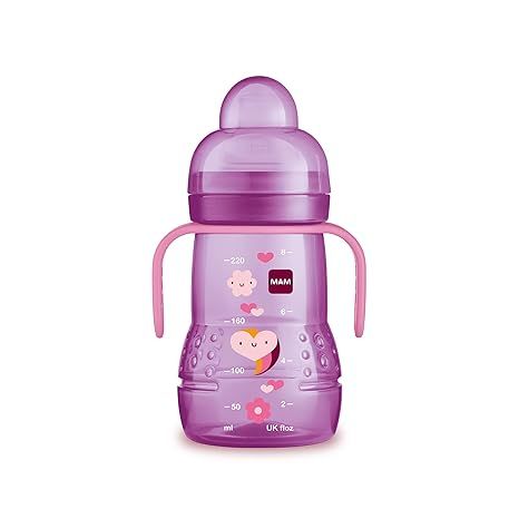 MAM Plastic Trainer Cup (1 Count), 8 oz. Trainer Drinking Cup with Extra-Soft Spout, Spill-Free Nipple, and Non-Slip Handles, for Girls 4+ Months, Designs May Vary