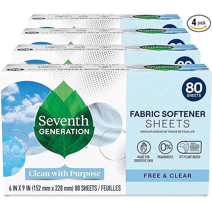 Seventh Generation Dryer Sheets are a fabric softener product that is fragrance-free and made without any artificial dyes or synthetic fragrances. Each pack contains 80 sheets, and this listing includes a total of 4 packs. These dryer sheets are designed to naturally reduce static cling and soften your clothes, making them more comfortable to wear.