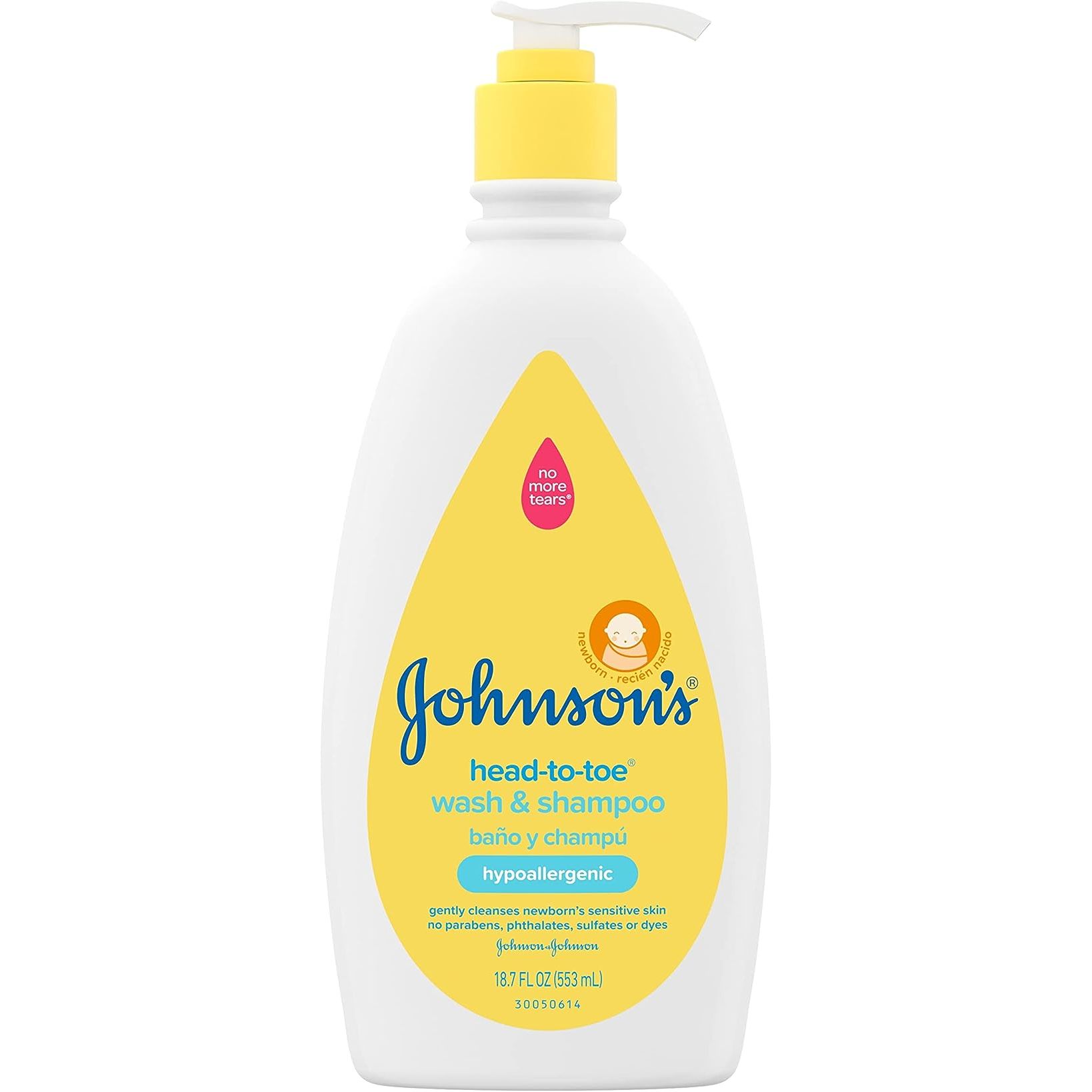18.7-fliud ounce bottle of Johnson's Head-To-Toe Baby Body Wash & Hair Shampoo to gently care for your baby's sensitive skin. Same great formula, new and improved packaging for better experienceThis hypoallergenic baby bath wash is free of parabens, phthalates, sulfates, dyes, & harsh fragrances & is gentle enough for your baby's delicate skin & hair & good for the whole family. Johnson's does not test on animalsPediatrician-tested & pH-balanced gentle cleanser to maintain baby's natural skin moisture barrier. 9 out of 10 parents would recommendNo More Tears formula makes this 2-in-1 baby wash & shampoo tear-free & as gentle to your baby's eyes as pure water. The ultra-mild cleanser washes away 99.9% of germs & is perfect for baby's sensitive skin & hairApply baby shampoo & body wash during bathtime with warm water using hand or washcloth, gently lather, rinse, & follow with gentle massage using Johnson's Head-To-Toe Baby Lotion