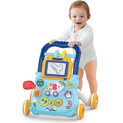 Introducing the Sit-to-Stand Baby Walker Toys, a must-have for encouraging and assisting your baby in taking their first steps. This walker not only helps build their coordination and strength but also enhances their hand-eye coordination and dexterity. The removable play panel is packed with engaging features such as a drawing board, shape recognition blocks, toy stickers, a fun electronic piano, colorful rotatable gears, and a rattle. It's a perfect activity center that starts with playtime, allowing your little one to improve their color recognition and shape recognition skills. The adjustable speed feature ensures safety, while the soft rubber ring provides excellent friction for better control. Made of safe non-toxic ABS material, this sit-to-stand walker is a great gift choice for infants, babies, and toddlers, making it an ideal present for birthdays, newborns, or Christmas.