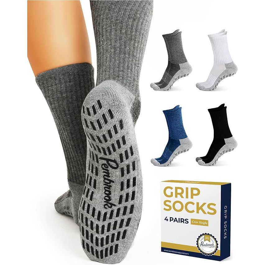 The Pembrook 4 Pairs Crew Non Slip Socks are designed to provide traction and stability for men and women during various activities such as yoga, pilates, barre, and even in hospital settings. These gripper socks feature a non-slip silicone grip on the sole that helps prevent slipping and sliding on smooth surfaces.
