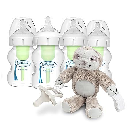 Dr. Brown’s Natural Flow® Anti-Colic Options+™ Wide-Neck Baby Bottle, 9 oz/270 mL, Level 1 Nipple, 4-Pack, 0m+ with Lovey Pacifier Holder with Silicone HappyPaci, Sloth, 0-12m