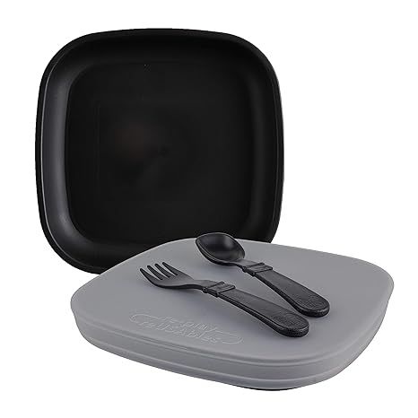 Re Play, a popular American brand, offers a 5-piece toddler feeding set that is proudly made in the USA. This set includes two deep flat plates, a silicone storage lid, and two utensils. What sets this product apart is its eco-friendly composition, as it is made from BPA-free recycled milk jugs.