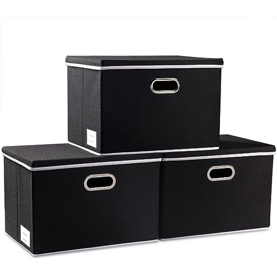 PRANDOM Large Foldable Storage Boxes with Lids [3-Pack] Fabric Collapsible Storage Bins Organizer Containers Baskets Cube with Cover for Home Bedroom Closet Office Nursery Black(17.7x11.8x11.8)