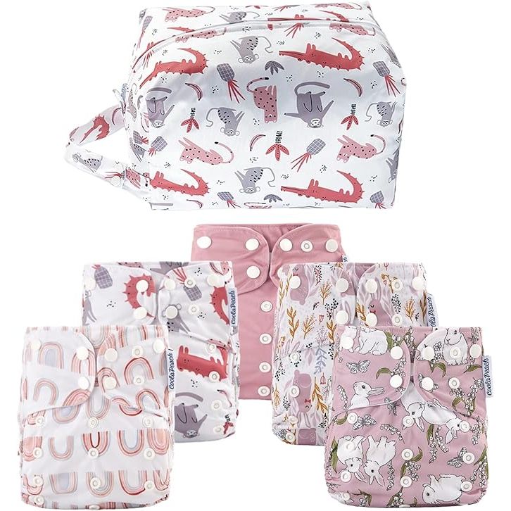 CoolaPeach Baby Cloth Diapers are a set of washable and reusable diapers designed for baby girls. The diapers come in a pack of 5, along with 5 microfiber inserts and one waterproof bag. These diapers are one-size adjustable, making them suitable for babies of different sizes and ages.